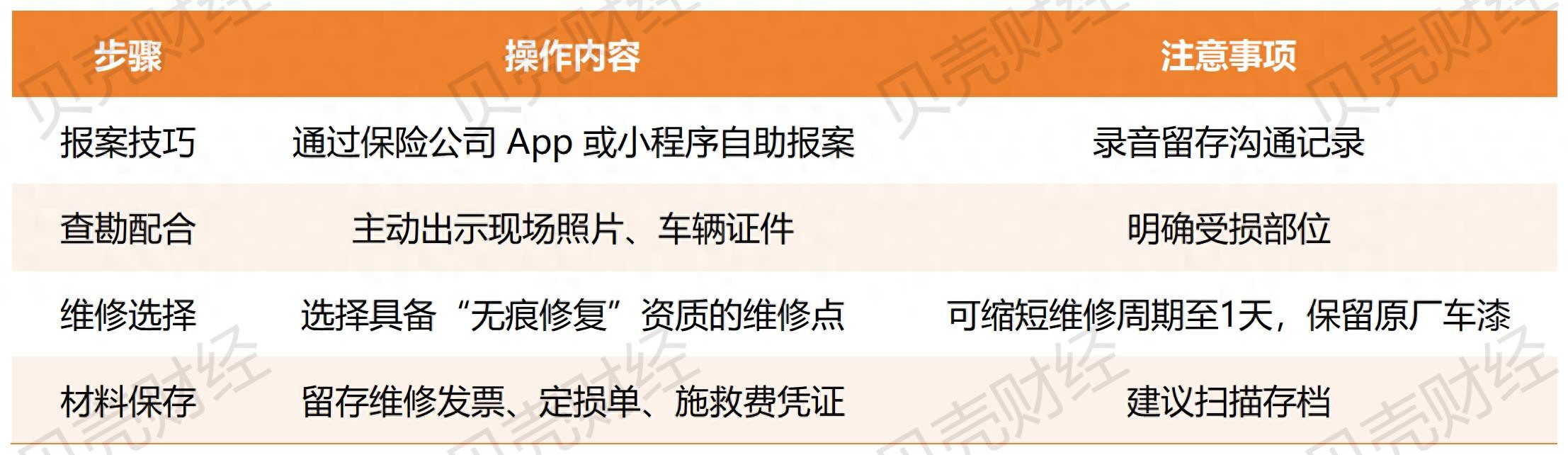 车险报案与维修技巧表。贝壳财经记者根据北京金融法院法官的介绍整理制作。
