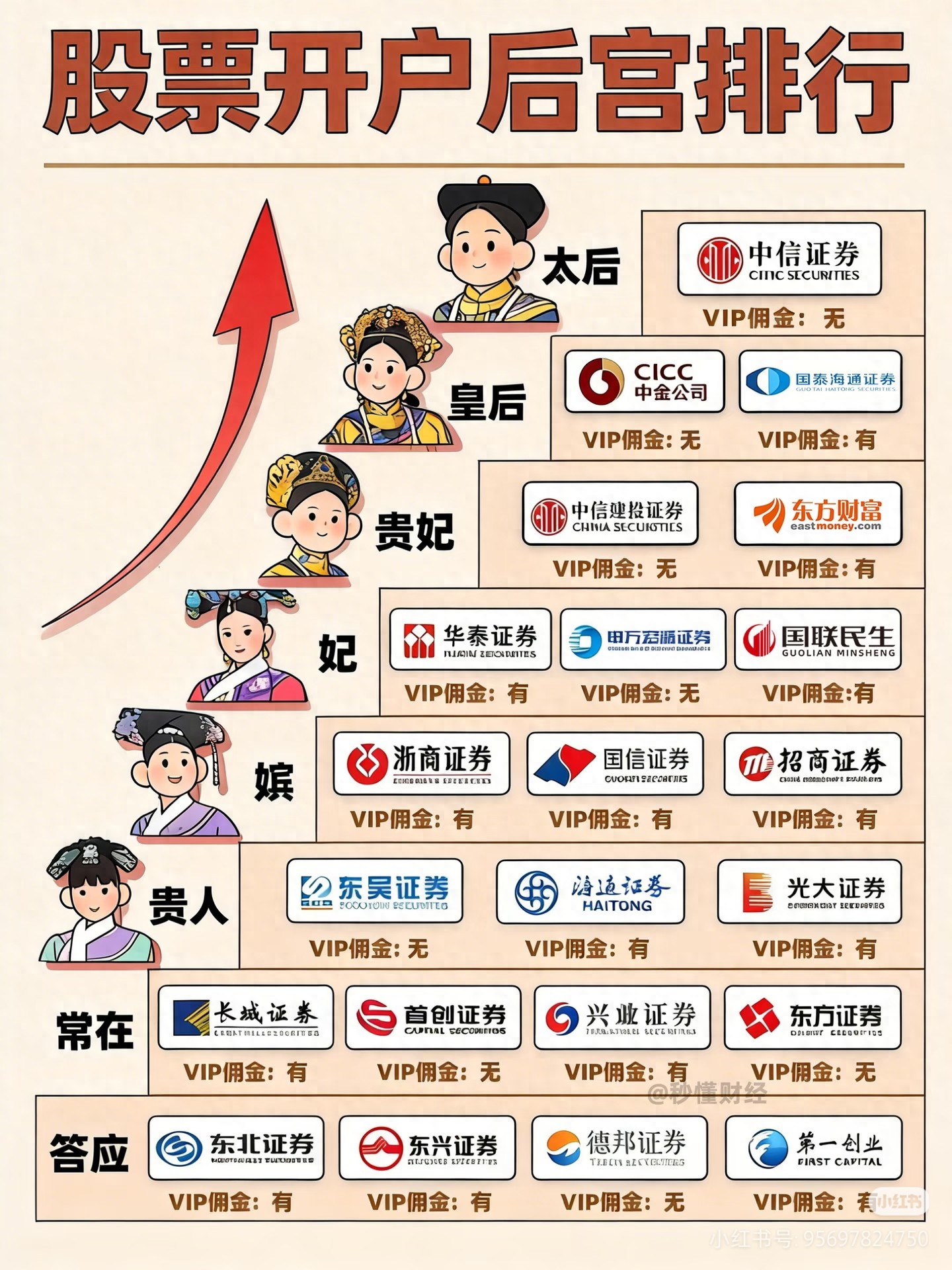 这张图用《甄嬛传》后宫位份做类比,给国内主流券商做了分级,核心参考维度是品牌实力、市场地位、VIP佣金可谈空间...