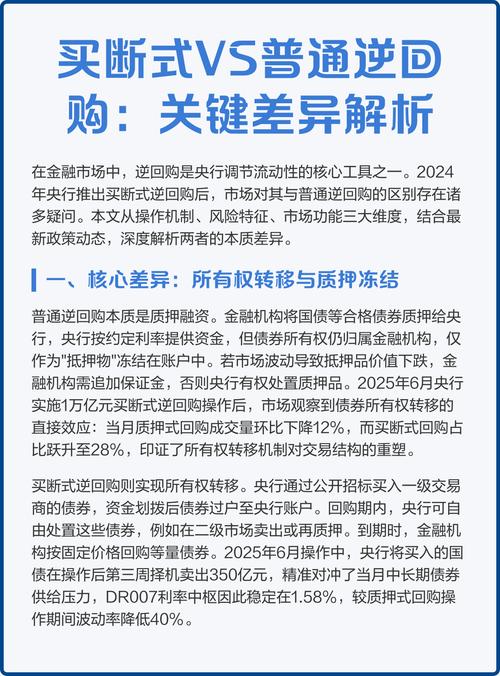 目前,央行基本形成每月5日前后开展3个月期买断式逆回购、15号前后开展6个月期买断式逆回购、25号开展MLF操作的中长期资金投放模式。近期发布的2025年第三季度中国货币政策执行报告(以下简称《报告》)显示,第三季度质押式回购与买断式回购对比:央行如何通过逆回购操作维持流动性充裕?,买断式逆回购和MLF操作合计净投放1.5万亿元,为保持市场流动性充裕奠定基础,也为金融机构流动性管理提供便利。