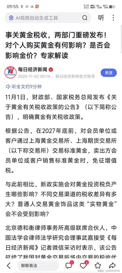 黄金交易税收新规落地。11月1日,财政部、税务总局发布《关于黄金有关税收政策的公告》(以下简称《公告》),明确自2025年11月1日起至2027年12月31日...