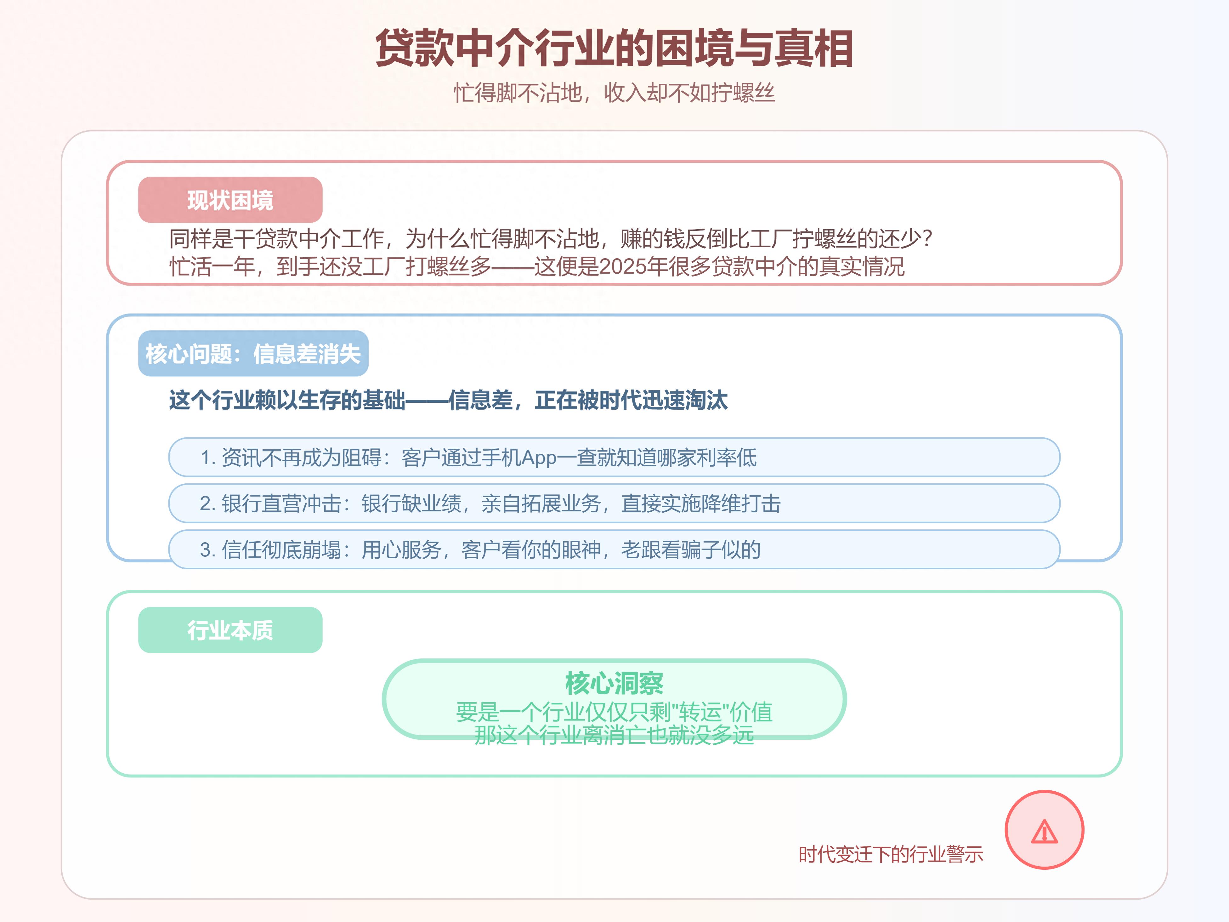同样是干贷款中介工作的,为什么你忙得脚不沾地,可赚的钱反倒比工厂里拧螺丝的还少?忙活一年,到手还没工厂打螺丝多。也许,这便是 2025 年很多贷款中介的真实情况。差在哪?...